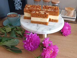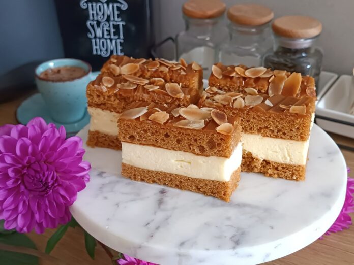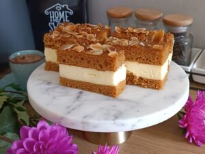 Ciasto „Krówka” na miodowym biszkopcie to połączenie puszystego ciasta z aromatem miodu i słodkiej, kremowej masy krówkowej. To idealny wypiek na rodzinne spotkania czy święta – wygląda efektownie, a przygotowanie jest naprawdę proste. Delikatny biszkopt z nutą miodu świetnie komponuje się z kajmakowym nadzieniem, tworząc deser, któremu trudno się oprzeć.