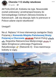 Podjęto decyzję o próbie ratowania życia noworodka i wykonano ratownicze cesarskie cięcie na miejscu tragedii. Dziecko zostało uratowane i w ciężkim stanie przetransportowane do Górnośląskiego Centrum Zdrowia Dziecka w Katowicach.