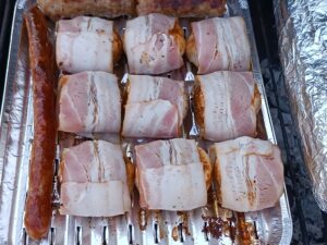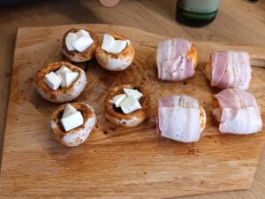 Owiń boczkiem: Każdą pieczarkę owiń jednym plastrem boczku (jeśli boczek jest cienki, można użyć 2 plastrów). Można spiąć wykałaczką, by się nie rozwinął.