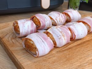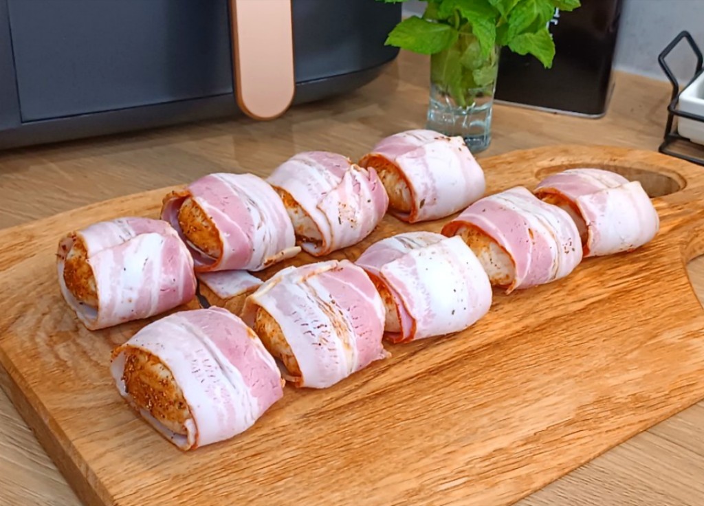 W air fryerze: Ustaw temperaturę na 180°C i piecz przez ok. 10–12 minut. Możesz obrócić je w połowie czasu, by boczek zrumienił się równomiernie.