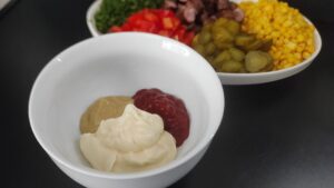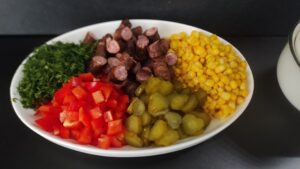 Krok 3. Kukurydzę odsącz z zalewy i dodaj do papryki, kabanosów i ogórków. Posiekaj drobno koper i także przełóż do miski z resztą składników.