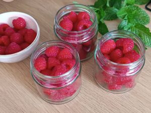 Układanie malin: Do suchych słoików delikatnie włóż maliny – nie ugniataj ich, by zachowały kształt.
