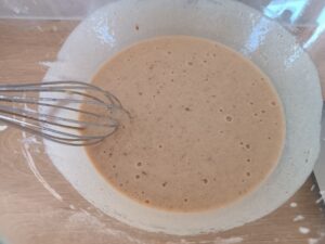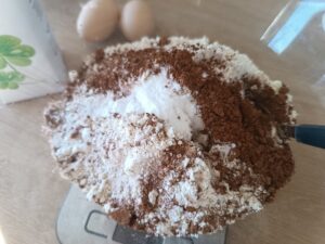 Krok 3. Do wymieszanych mokrych składników dodajemy stopniowo wymieszane suche składniki. Całość wymieszaj dokładnie drewnianą łyżką.