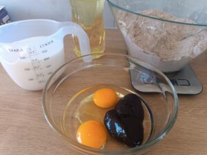 Krok 2. Do drugiej dużej miski wbij dwa jajka, dodaj kefir, olej oraz dwie łyżki powidła śliwkowego. Całość wymieszaj rózgą kuchenną na jednolitą masę.