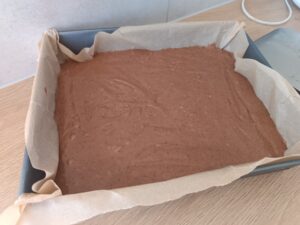 Krok 4. Przygotuj formę do pieczenia ok. 24×24 cm. Wyłóż ją papierem do pieczenia i wylej na nią ciasto.