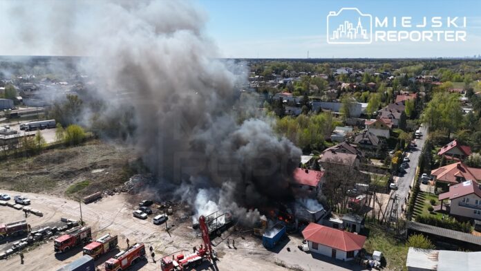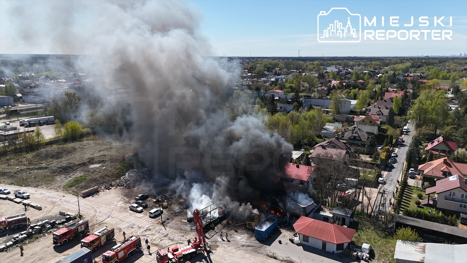 Pożar magazynu i pojazdów pod Warszawą. Gęsty dym widoczny z wielu kilometrów