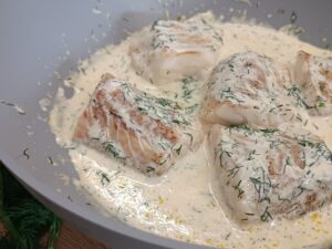 - Polej dorsza sosem lub włóż rybę bezpośrednio do sosu.