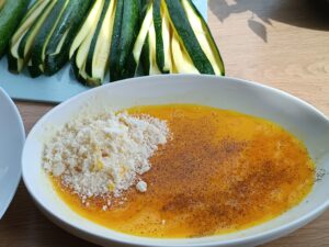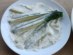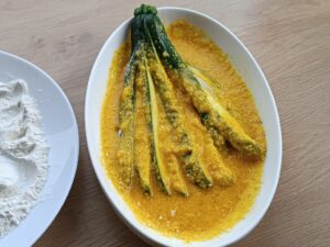 Krok 4. Cukinie dokładnie obtocz w mące. Następnie w jajku i smaż na dużej rozgrzanej patelni na średniej mocy palnika.