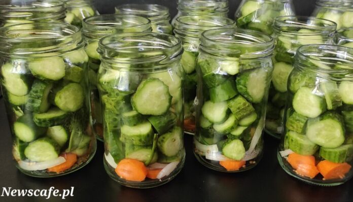 Krok 8. Ogórki zalewamy ciepłą zalewą. Słoiki należy pasteryzować.