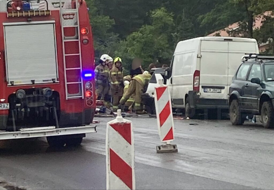 W wyniku wypadku, uszkodzony samochód osobowy stoi na drodze, obok białego furgonu; w tle widoczne pojazdy policyjne.